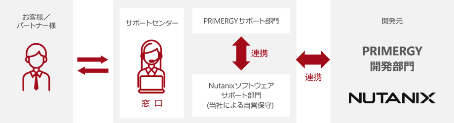 ハードウェア・ソフトウェアのサポートをワンストップで提供し、お客様・パートナー様向けに一本化された窓口で受け付け、トラブルの切り分けを手厚く支援します。またNutanixソフトウェアサポート部門を設置し、スピーディーな問合せを実施。もちろん、夜間でも日本語で対応します。