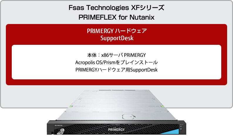 本製品は「Nutanix Enterprise Cloud OS」を構成するHCIソフトウェア「Acropolis」と管理ツール「Prism」をPRIMERGYにプレインストールし、ライセンス・サポートもFsas Technologies から提供する製品です。