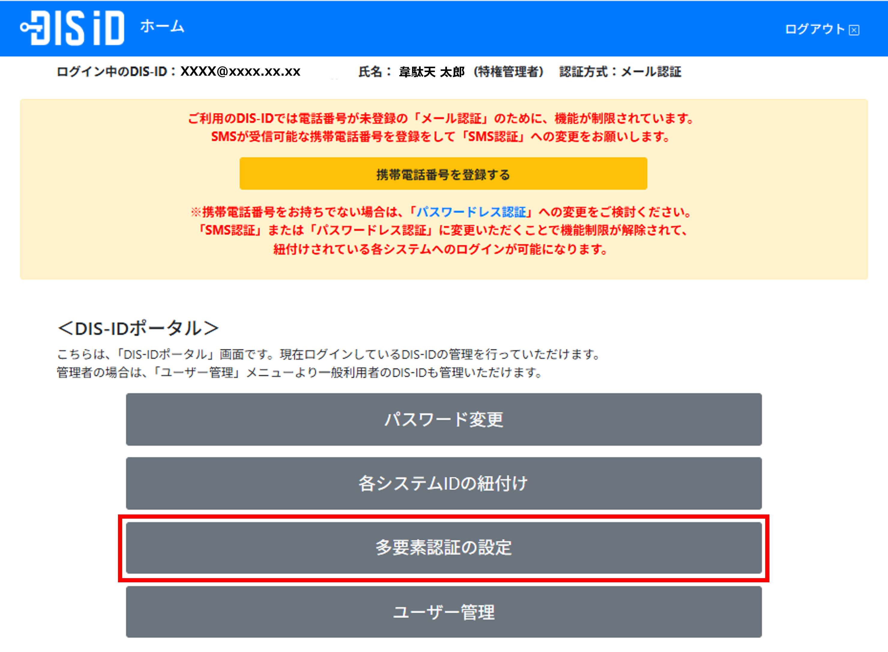 DIS-IDポータルにログインし、「多要素認証の設定」メニューを開きます。
