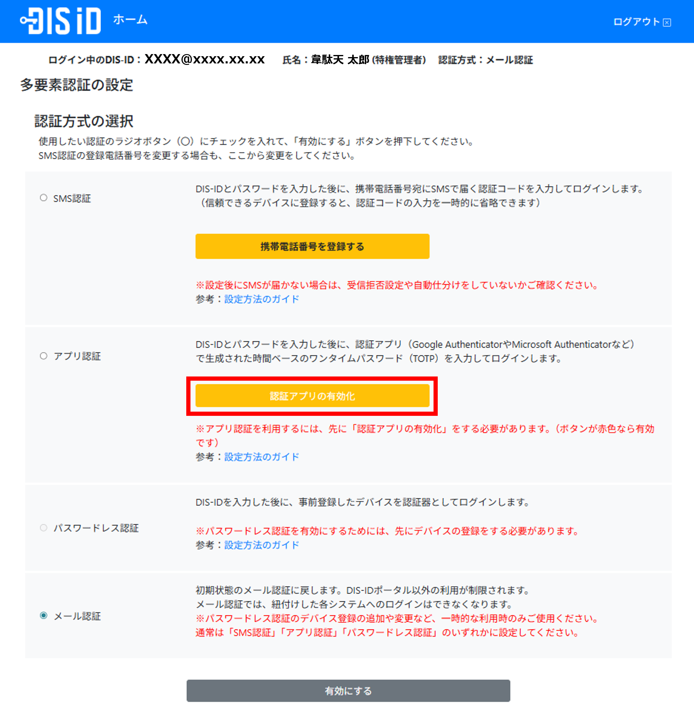 ラジオボタンの「アプリ認証」を選択してから、「有効にする」ボタンをクリックします。
