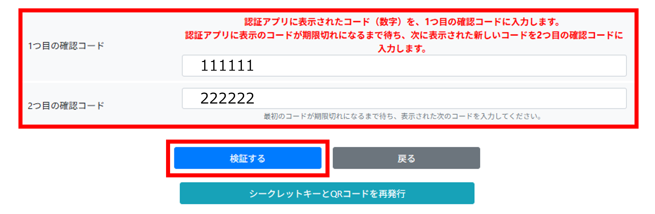 認証アプリに表示のコードが期限切れになるまで待ち、次に表示された新しいコードを2つ目の確認コードに入力してください。