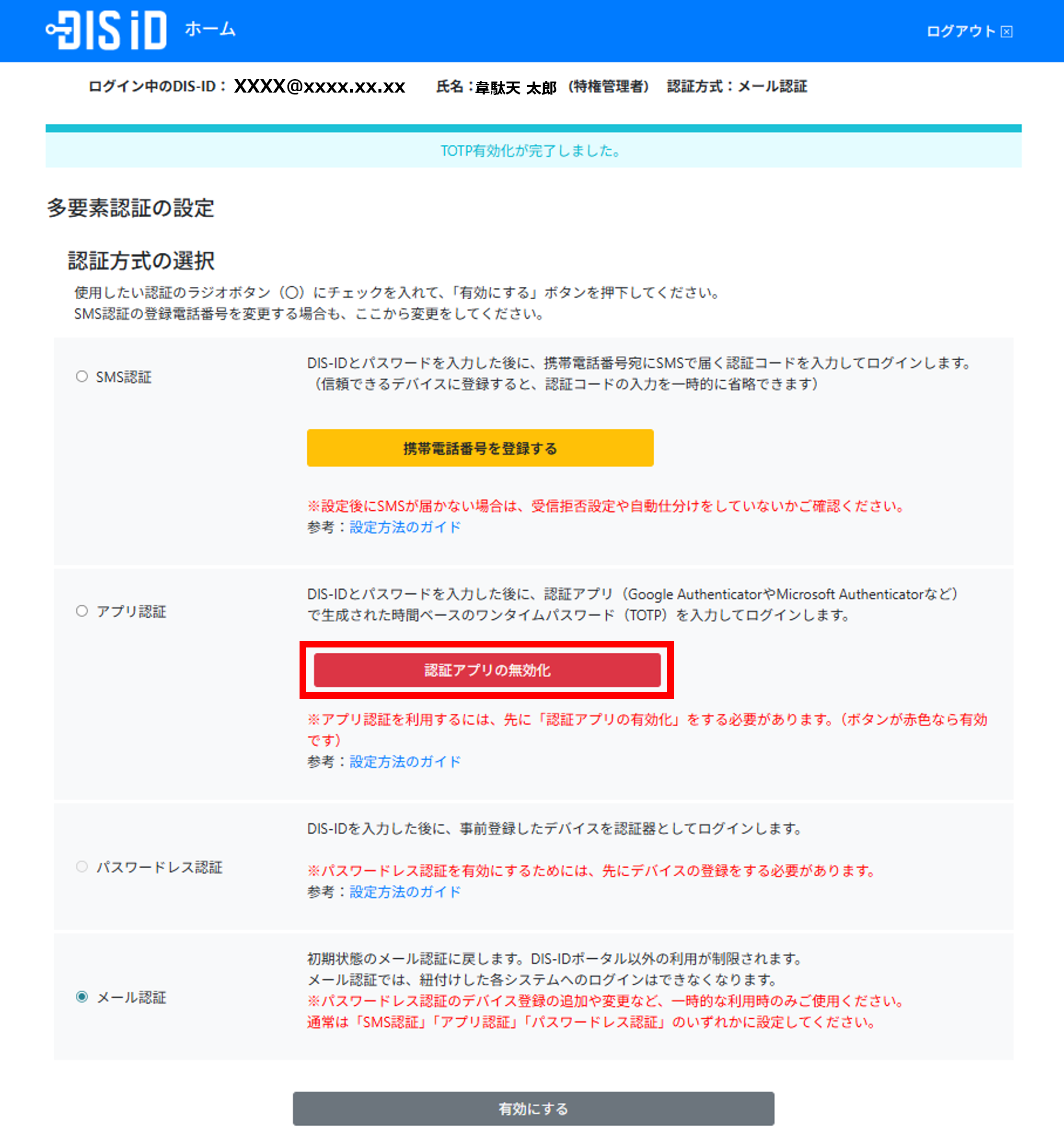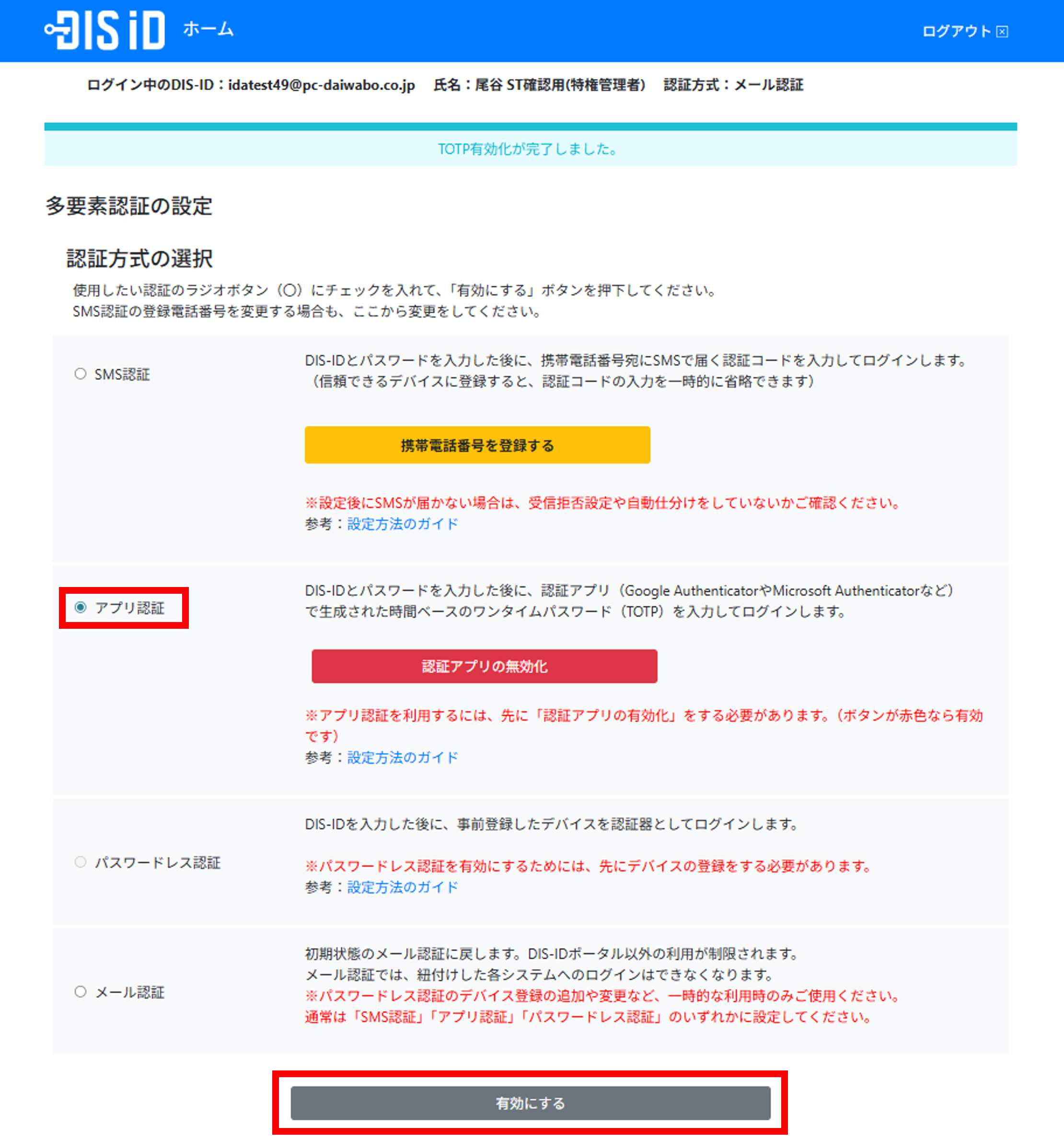 認証アプリの登録が完了すると、認証方式の選択で「アプリ認証」の設定ができるようになります。