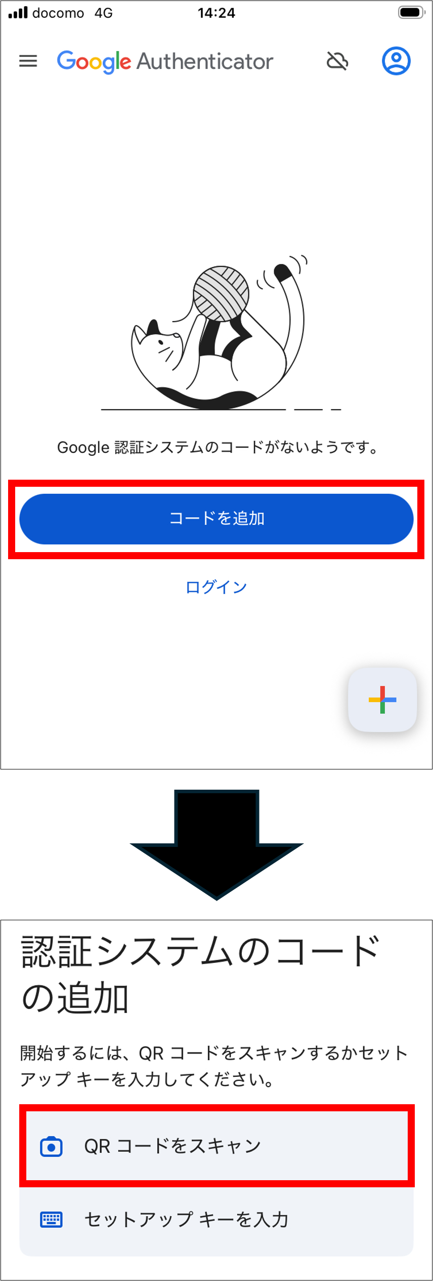 アプリを起動して「コードを追加」ボタンをクリックし