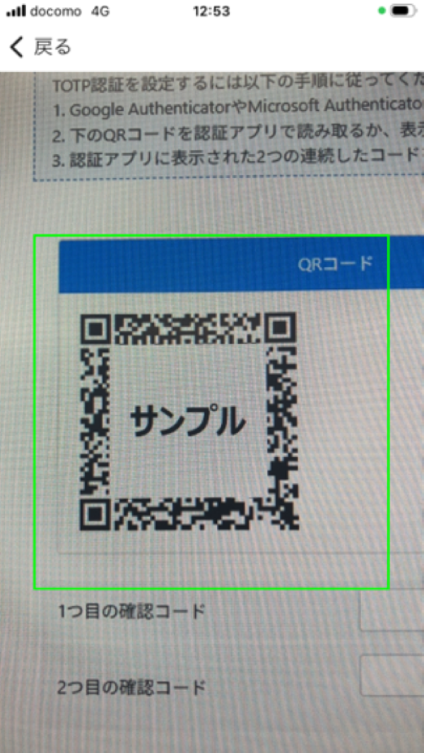 認証アプリに表示されている有効なコード(数字6桁)を、1つ目の確認コードに入力します。