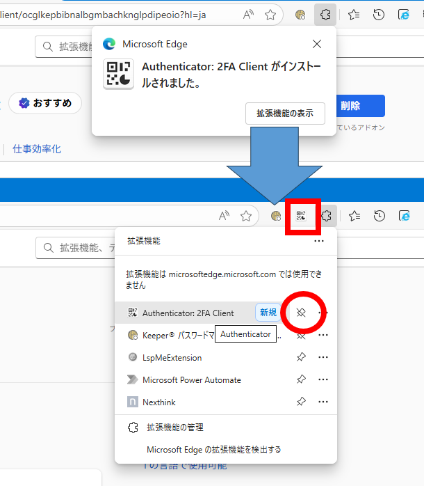 「Authenticator: 2FA ClientがMicrosoft Edgeに追加されました」と表示されたらインストール完了です。