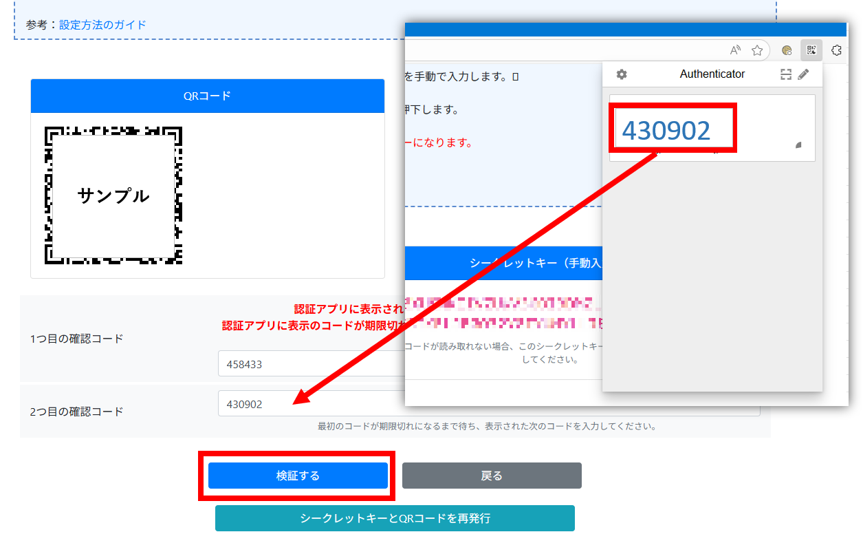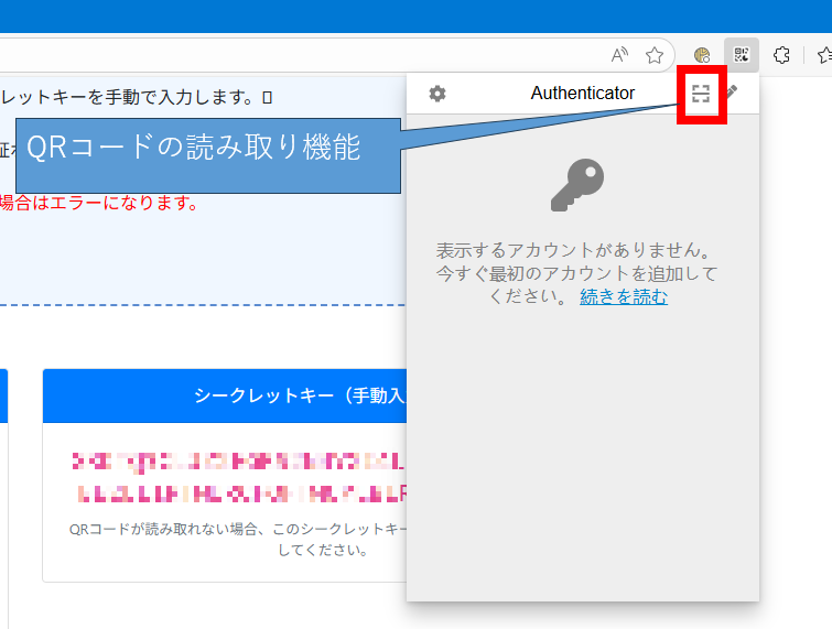 ※同じ画面でスマートフォン用の認証アプリでQRコードを読み取りをすることで、拡張機能と認証アプリの併用利用も可能です。