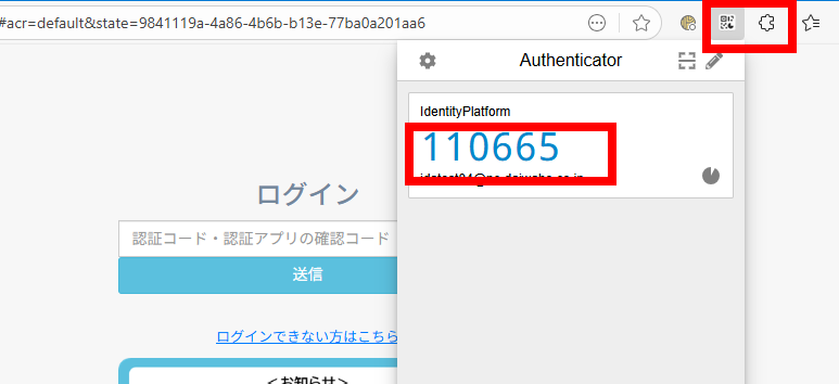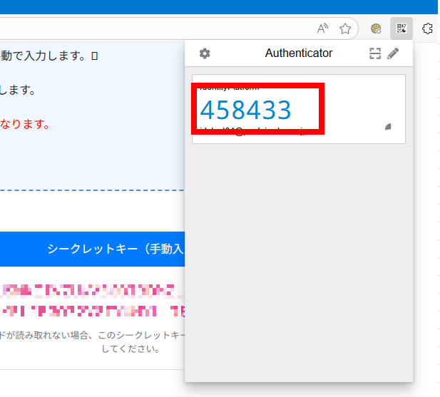 Authenticatorのアイコンをクリックすると、コード(数字6桁)が表示されます。認証アプリに表示されている有効なコード(数字6桁)を、1つ目の確認コードに入力します。