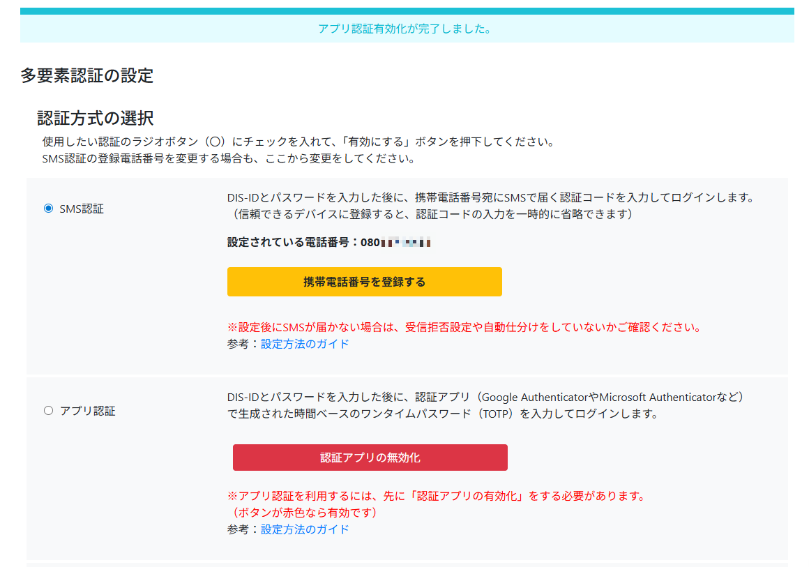 認証アプリの登録が完了すると、認証方式の選択で「アプリ認証」の設定ができるようになります。