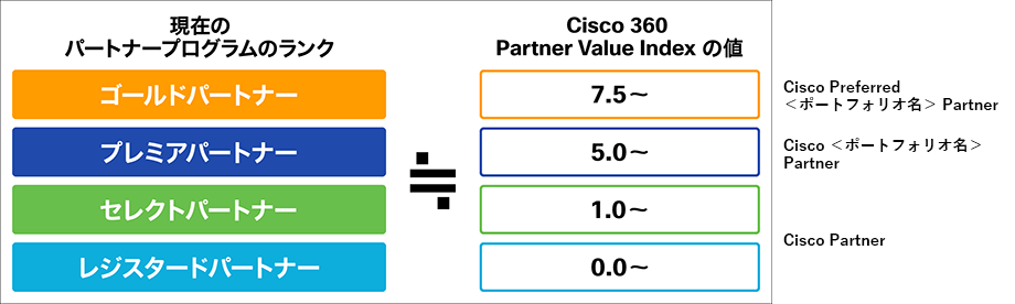 これまでパートナーランクとして用いてきた 「ゴールド」「プレミア」「セレクト」「レジスタード」の各レベルと、Cisco 360 の評価基準となる Partner Value Index の値の関係は、おおむね下図のようになります。