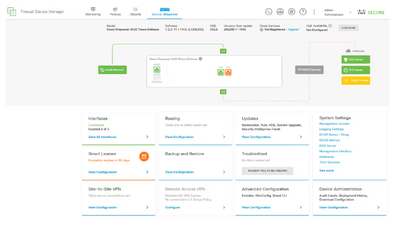 アプライアンスに内蔵されている管理ツール「Secure Firewall Device Manager」の画面が見やすくなり、セキュリティイベントや機器の状態など各種情報を 1 つの画面でわかりやすく確認できます。