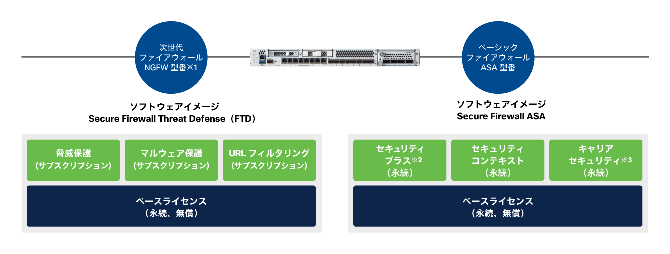 Cisco Secure Firewall の購入時には、それぞれのファイアウォールに対応するソフトウェアイメージを搭載したハードウェア(物理ファイアウォールの場合※1)またはソフトウェア(仮想ファイアウォールの場合)を選択します。