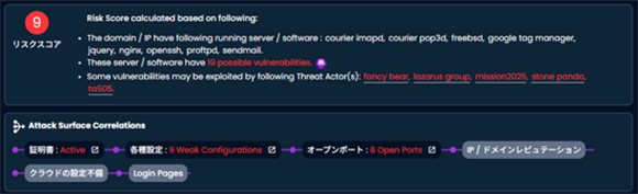 自社が利用しているサブドメインに紐づくサーバーやソフトウェアの情報が、外部の攻撃者からどのように見えるのか、潜在的な脆弱性や問題は何かを可視化します。