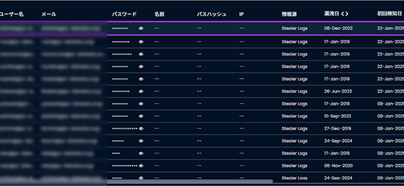 メールアドレスとパスワードの漏洩があった場合にDeCYFIRのUIで漏洩日などを確認することが可能です。