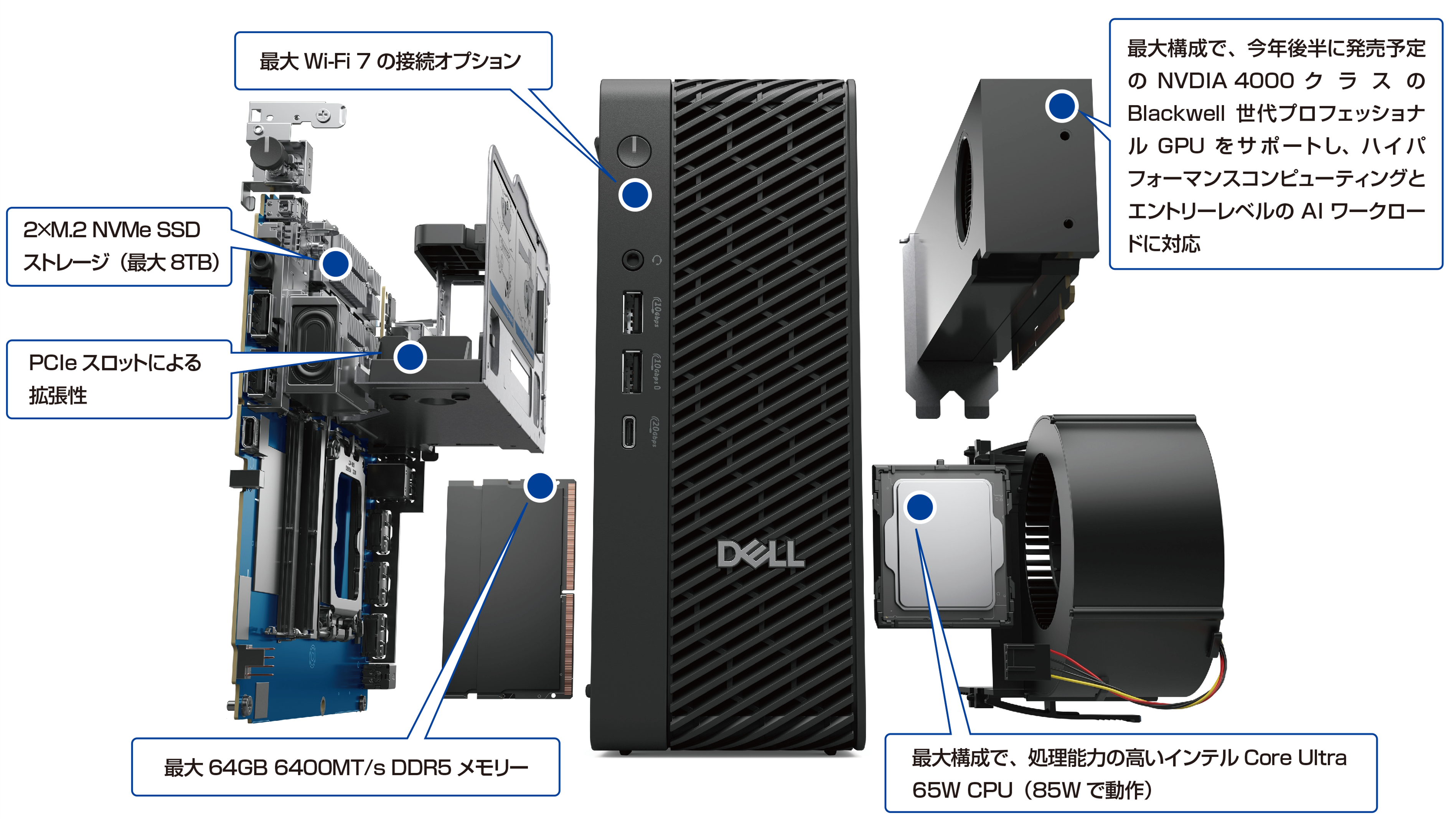 この世代のイノベーターを力づけるインテル® Core Ultraプロセッサー、パフォーマンスを最大化する次世代のNVIDIAプロフェッショナル グラフィックスやオプションのポートで最大9種類の異なる構成に対応するカスタマイズ可能な接続など、様々なワークスペースに最適なコンパクト設計のDell Pro Max マイクロ デスクトップ。