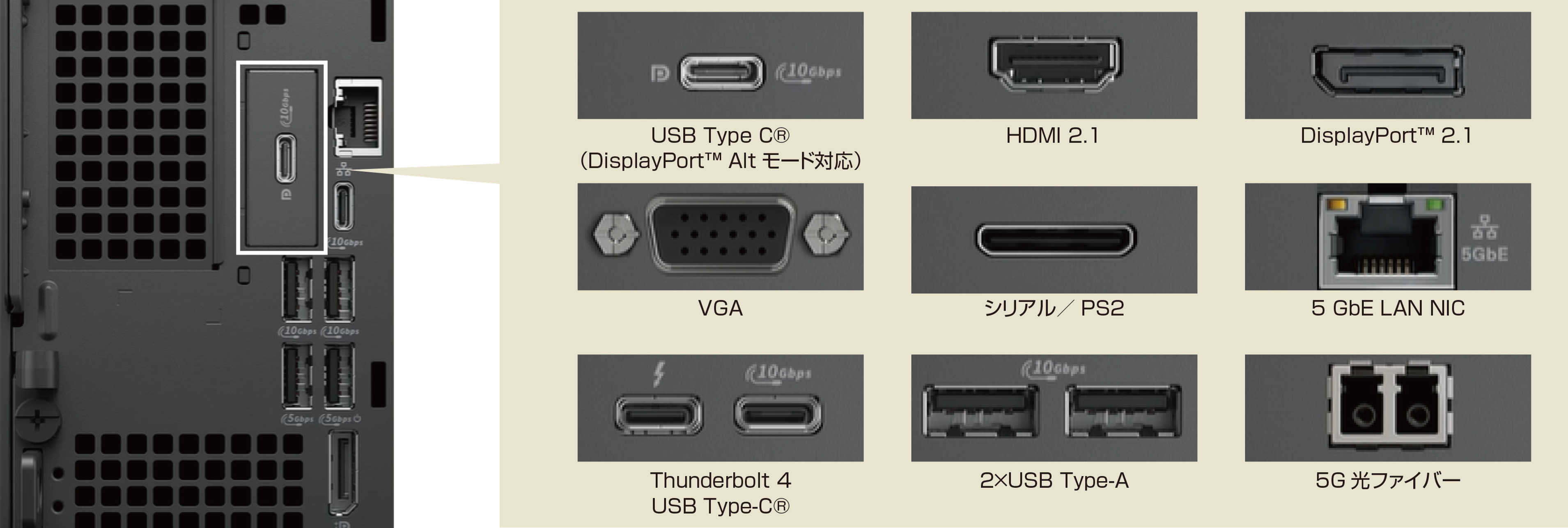 お客様固有のニーズに合わせた豊富な接続オプション。複数台のモニター、高速ストレージ デバイス、基本の周辺機器など、多彩なデバイスを接続できます。これまでにない汎用性と効率性を備える高性能パソコンです。