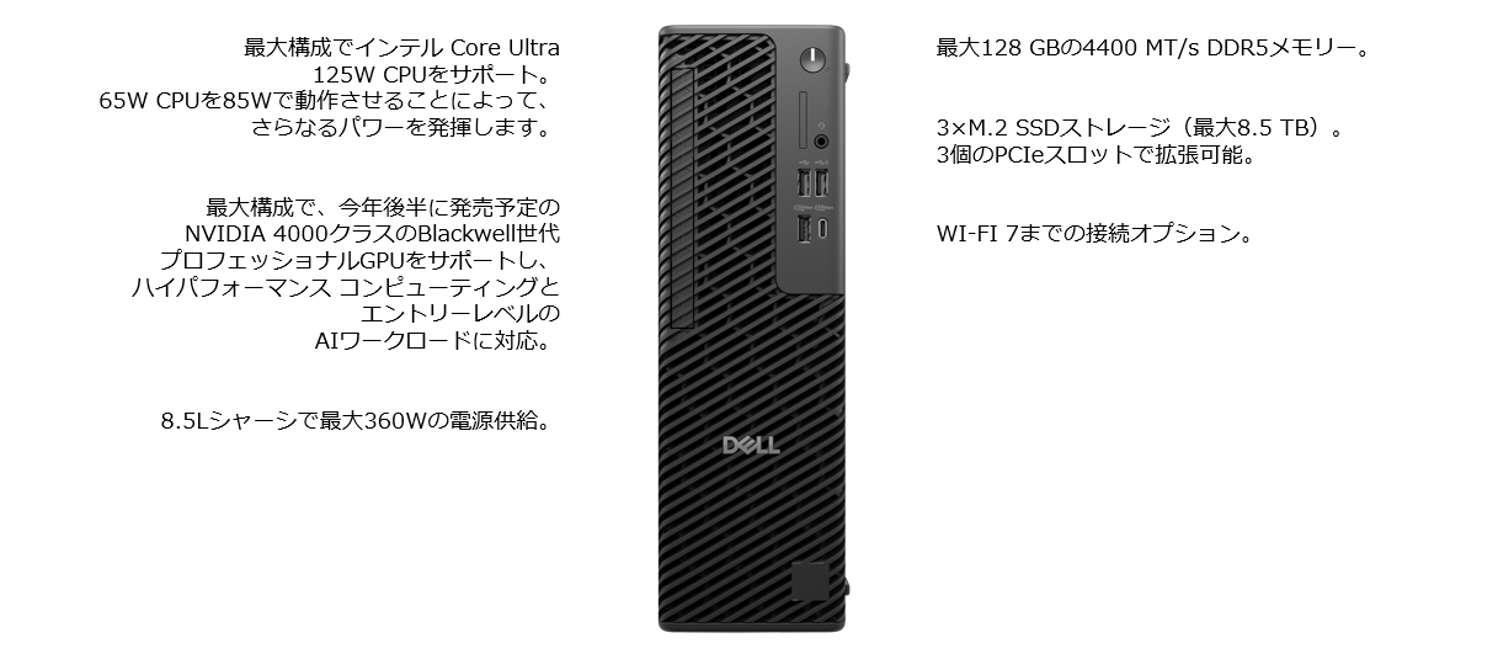 この世代のイノベーターを育むインテル® Core Ultraプロセッサー、パフォーマンスを最大化する次世代のNVIDIAプロフェショナルグラフィックス、より大容量で高速なメモリー、高度な熱設計など驚異的な高速CPUとGPUのパフォーマンスを備えた8.5Lのデザインで、比類のないスピードを体験してください。