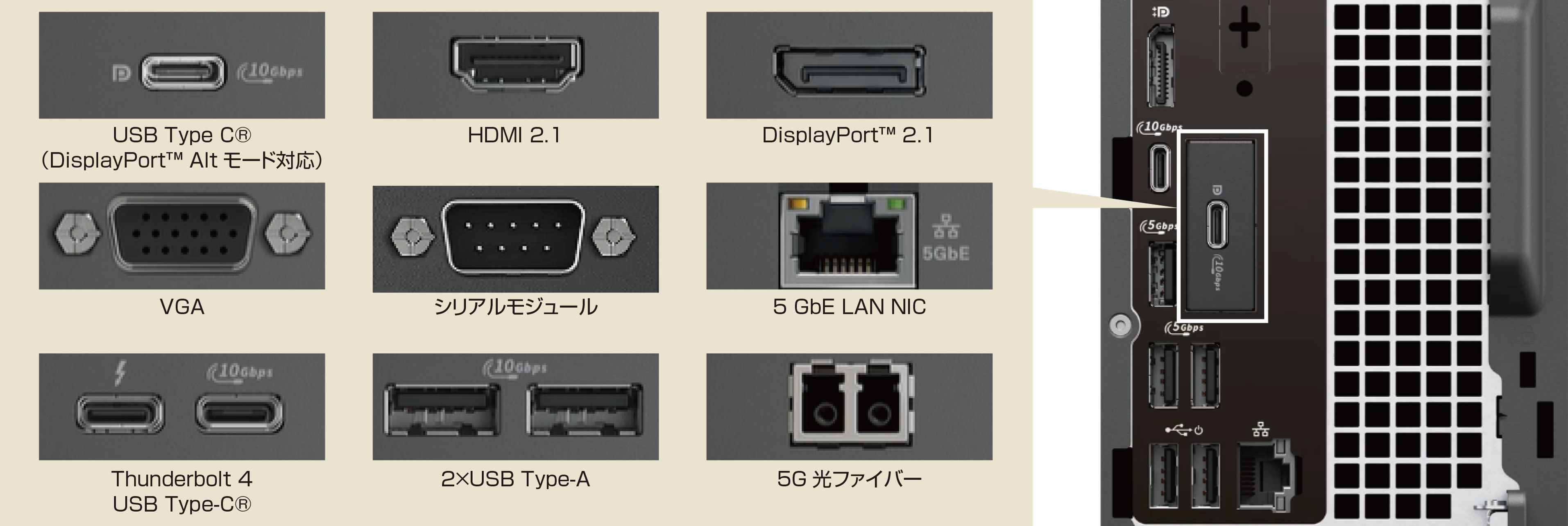 お客様固有のニーズに合わせた豊富な接続オプション。複数台のモニター、高速ストレージ デバイス、基本の周辺機器など、多彩なデバイスを接続できます。これまでにない汎用性と効率性を備える高性能パソコンです。