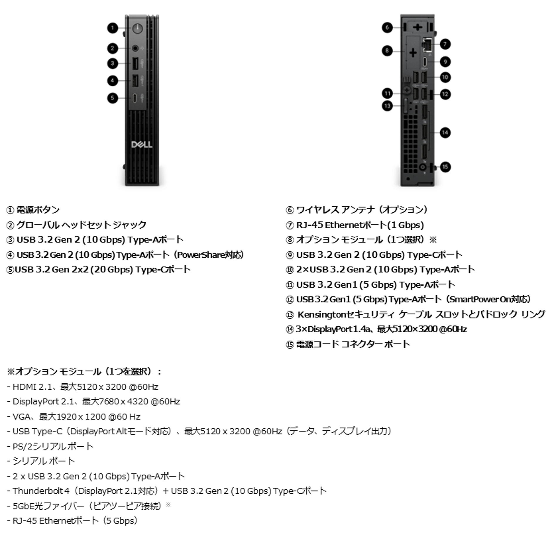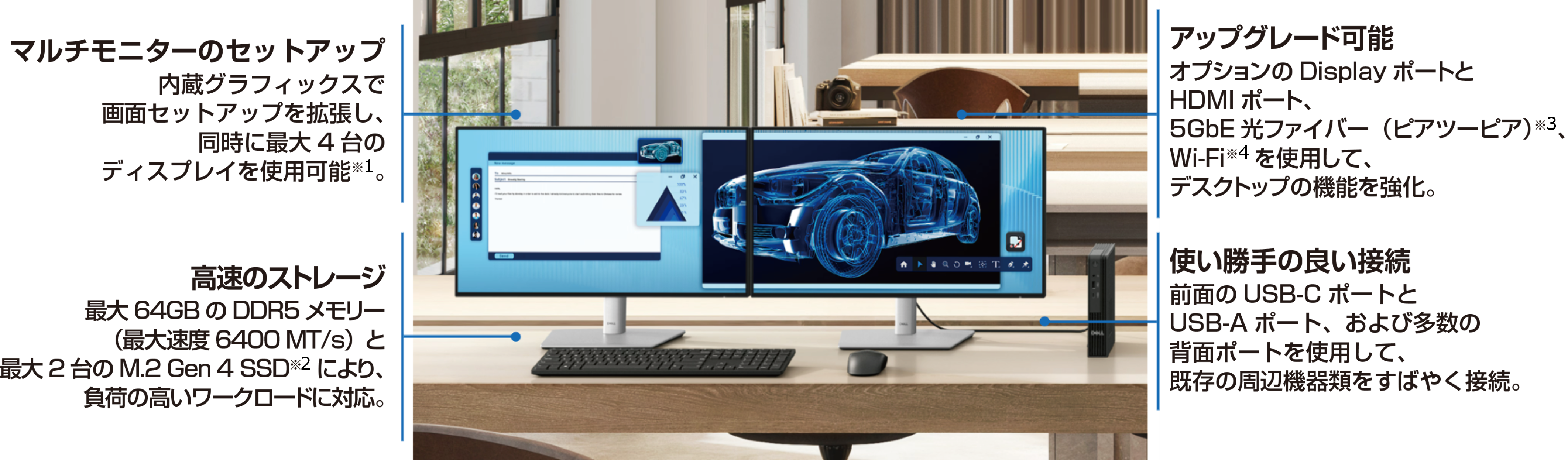 ※1:4台のモニターをサポートします。DisplayPort 1.4aを介してデイジー チェーン接続することで利用できます。モニターの最大解像度とリフレッシュ レートは、選択したビデオ ポートの仕様で決まります。また、デイジー チェーン接続されている追加の各モニターによって制限される場合があります。1台以上のモニターを接続した場合に想定されるモニター解像度は次の通りです。 ネイティブDisplayPort 1.4aを1つ搭載しており、以下の表示が可能:- 1台のモニターで5120 x 3200 (60Hz)の解像度まで対応、- MST/デイジー チェーン接続により2台のモニターで3840 x 2160 (60Hz)の解像度まで対応、- MST/デイジー チェーン接続により3台のモニターで2560 x 1600 (60Hz)の解像度まで対応、- MST/デイジー チェーン接続により4台のモニターで2560 x 1440 (60Hz)の解像度まで対応。 ネイティブDisplayPort 1.4aを2つ搭載しており、以下の表示が可能:- 2台のモニターで5120 x 3200 (60Hz)の解像度まで対応、または - 3台のモニターで、1台は5K (60Hz)まで、2台はMST/デイジー チェーン接続により3840 x 2160 (60Hz)の解像度まで対応、または - 4台のモニターでMST/デイジー チェーン接続により2560x1440 (60Hz)の解像度まで対応。 ネイティブDisplayPort 1.4aを3つ搭載しており、以下の表示が可能 ・ 3台のモニターで最大5120 x 3200 (60Hz)の解像度、または4台のモニターで、2台は最大解像度5K、2台はMST/デイジーチェーン接続により最大解像度3840 x 2160 (60Hz)の解像度まで対応。 セットアップとトラブルシューティングの詳細については、Dell.com/Supportにアクセスして、Dell Proデスクトップ、Dell製モニターと周辺機器(製品モデル番号で検索)のテクニカル サポート資料を検索してください。