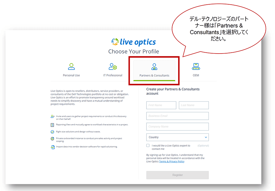 Live Opticsは独自でアカウントを管理しているため、最初にアカウントを作成する必要があります
