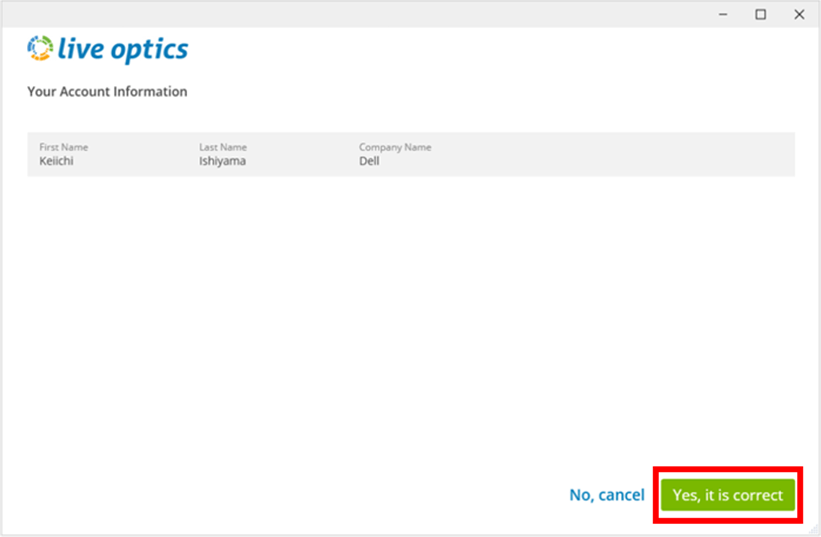 実行するアカウントの確認し『Yes, it is correct』を選択します