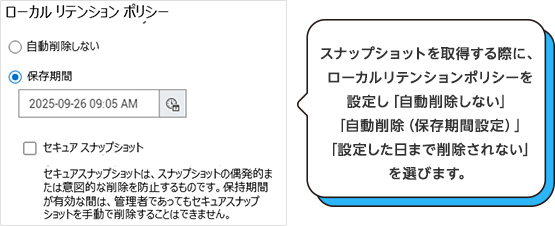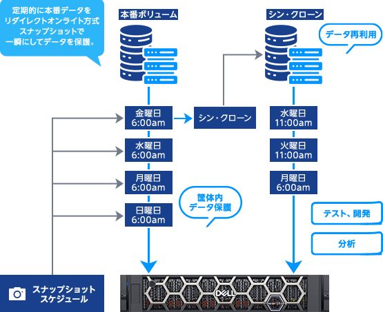 管理者が設定したスナップショット取得スケジュールにより、対象となる本番ボリュームのスナップショットを瞬時に取得