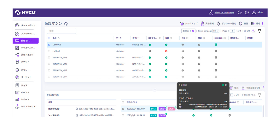 R-Shield Scanner仮想アプライアンスを展開することで、YARAルールを用いたマルウェア/ランサムウェア検出が可能になりました。スキャン対象はNutanixのスナップショットとなり、フルバックアップ後にはフルスキャンを実行し、増分バックアップ後には増分スキャンを実行します。本番に近いデータをスキャンすることで、お客様の運用環境をスキャンすることと同様の対応になります。