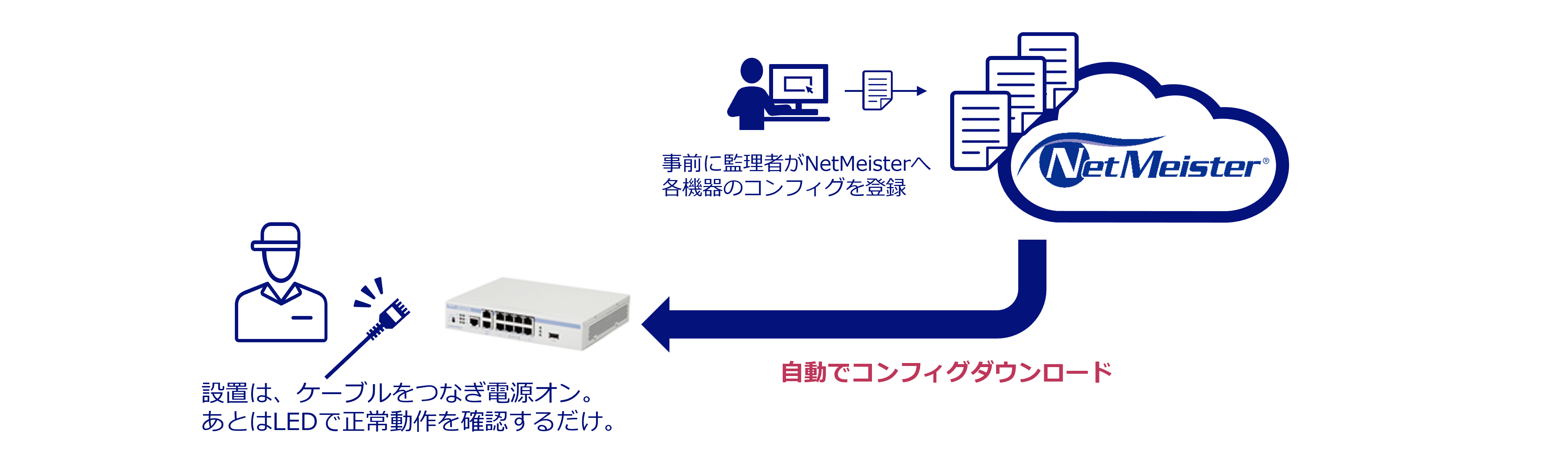 ゼロタッチプロビジョニングとは装置を工場出荷時状態で各拠点に展開し、設置時の作業者負担を軽減できる仕組みです