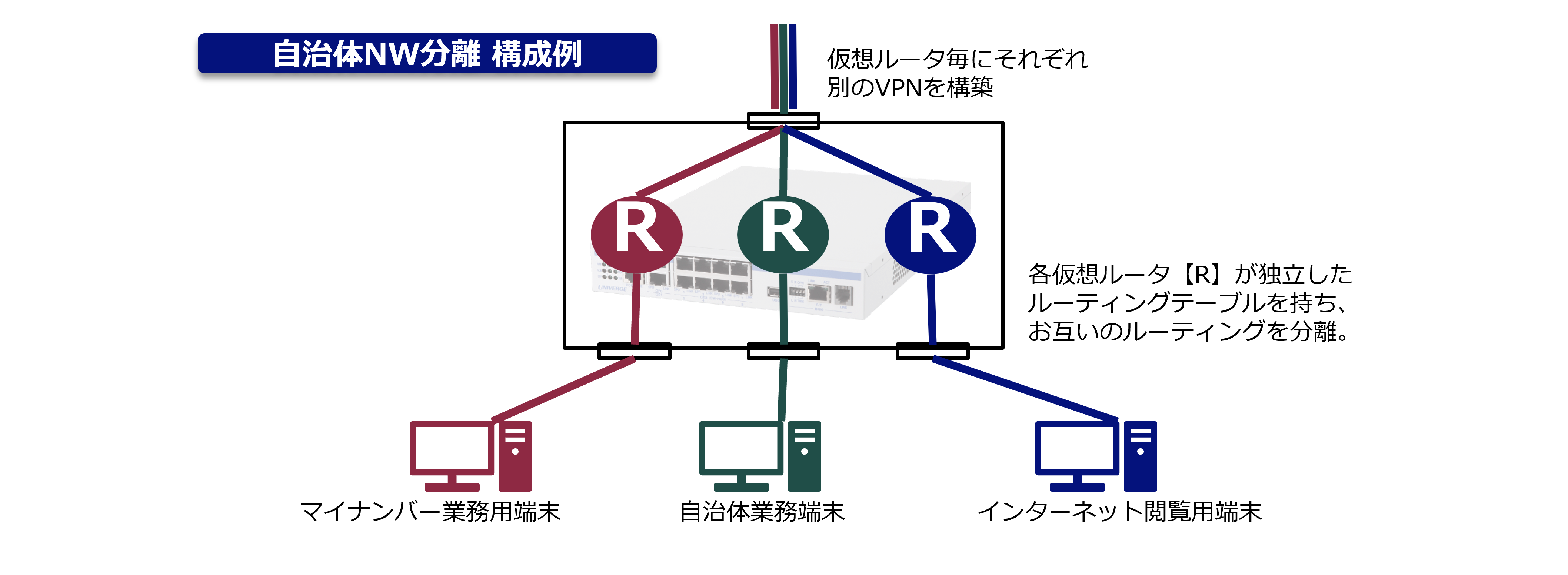 仮想ルータ(VRF)で、ベースルータと異なる独立したルーティングテーブルやフィルタポリシーを保持できるため、トラフィックの完全な分離が可能