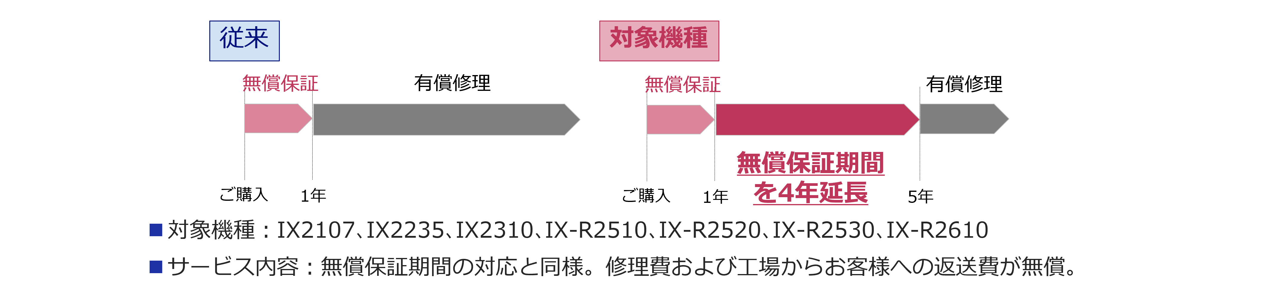 サービス内容:無償保証期間の対応と同様。修理費及び工場からお客様への返送費が無償