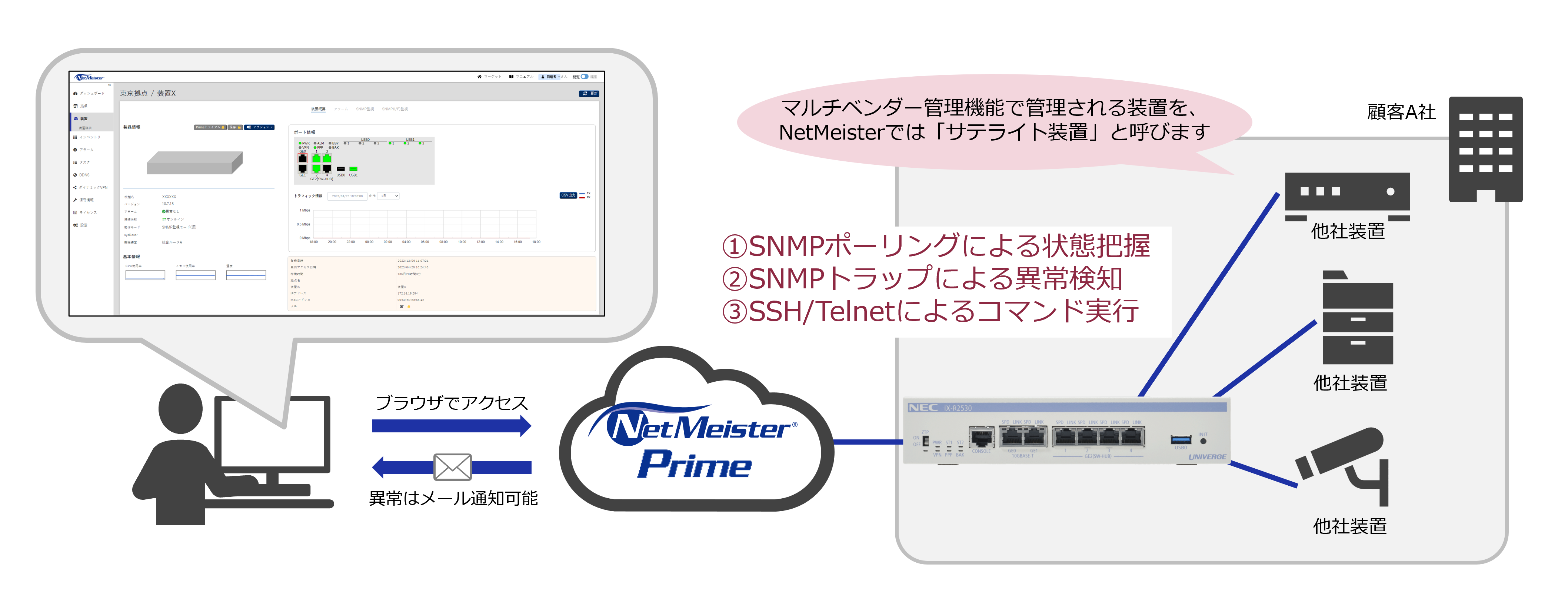 NetMeister と連携することでマルチベンダ管理機能を利用でき、IX-Rシリーズに接続されたSNMPに対応したサーバやネットワーク機器(他社製品)を1つの管理画面で一括で可視化・遠隔管理できます。
