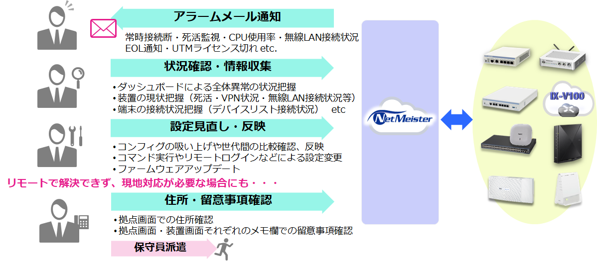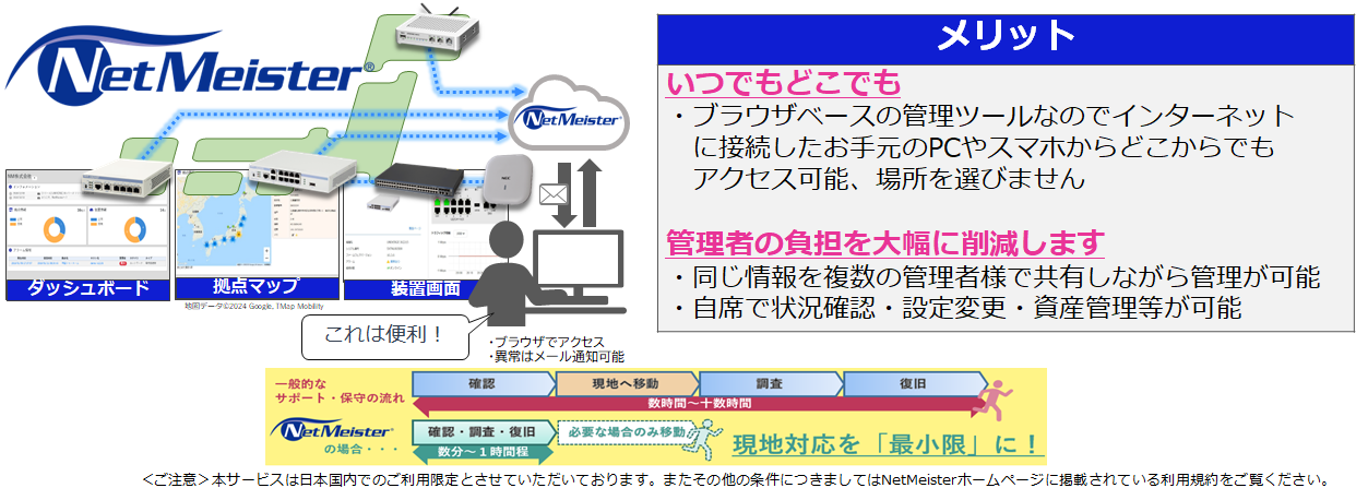 多拠点多数の装置を NetMeister で一元的にクラウドによる管理が可能に現地対応を 「最小限」にし、保守・サポートサービスの向上を支援します