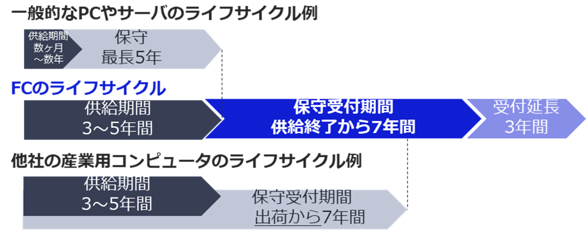 FC(ファクトリコンピュータ)は同一仕様製品を3~5年間供給、保守は供給終了後通常7年~10年実施します。