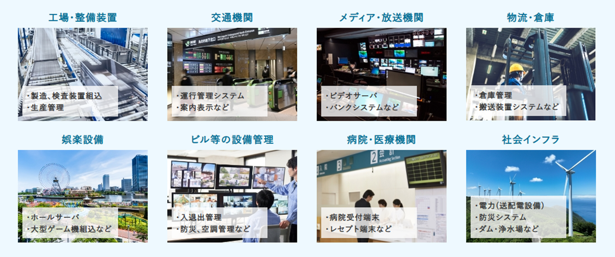ファクトリコンピュータは、文字通りファクトリ(工場)などの製造業での用途が一般ですが、「業務用途」であればどの様な業態でも使えます。長期供給・長期保守・24時間365日動作可能を活かせる業種であれば、提案可能です。