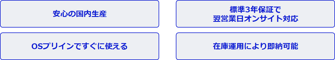 安心のサーバ運用を支援するためハードウェア標準保証を3年間無償提供、翌日オンサイトの出張修理サービスやパーツ保証を提供します。