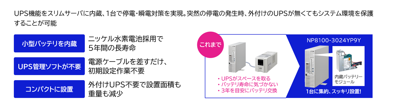 | NP8100-3024YPAY | UPS内蔵 | SATA HDD 2TB×2、RAID1 | 1,105,700円 | ||||