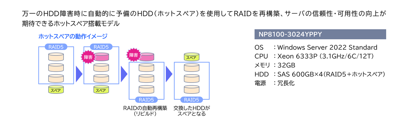 | NP8100-3024YPQY | 冗長電源 | SAS HDD 600GB×4、RAID5+HS | RAIDコントローラ搭載 | 1,991,700円 | |||