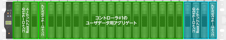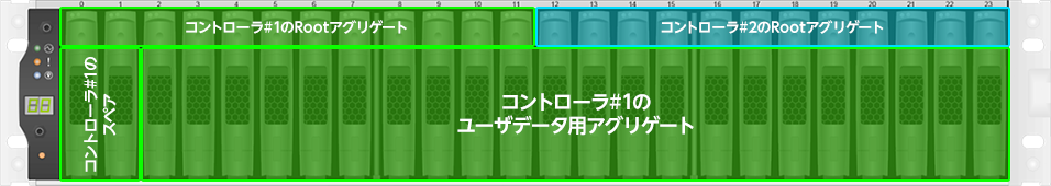 各コントローラのRootアグリゲート用に12個のRootパーティションが割り当てられています。12個のうち2つはスペアとして使用します。さらに2つはRAID-DPのパリティとして使用することになります。