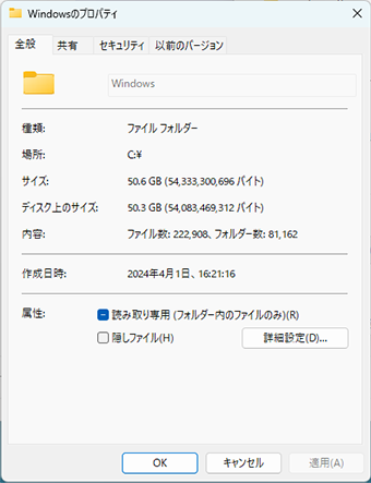 「C:\Windows」と言うフォルダにそのOSであるWindows 11の中心部分が格納されてるので、C:\Windowsフォルダのプロパティを見てみましょう。ストレージの使用量的には