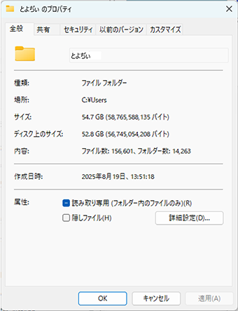 ちなみに、私の個人フォルダ「C:\Users\とよぢぃ」にはフォルダが約14,000個、ファイルは150,000個以上あって、ディスクの使用量はおおよそ53GBとなってます。自分しか使ってないPCですが、いつの間にこんなに溜めこんだんだっていう感じです。