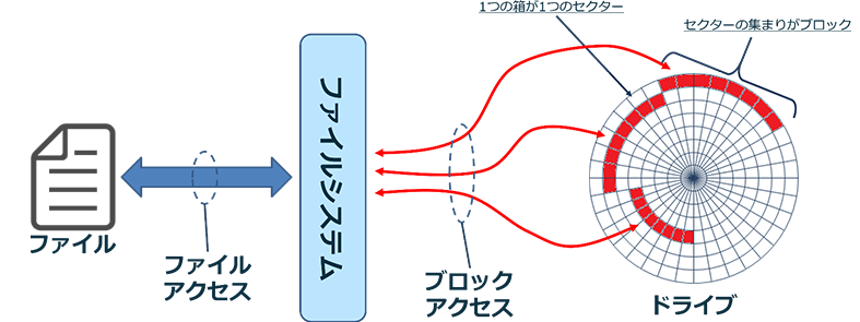 で、この辺までをざっくりまとめて絵にするとこんな感じになります。ブロックアクセスとファイルアクセスのはざまにいてブロックとファイルの関係性の管理しているのがファイルシステムの一番キモの部分になります。