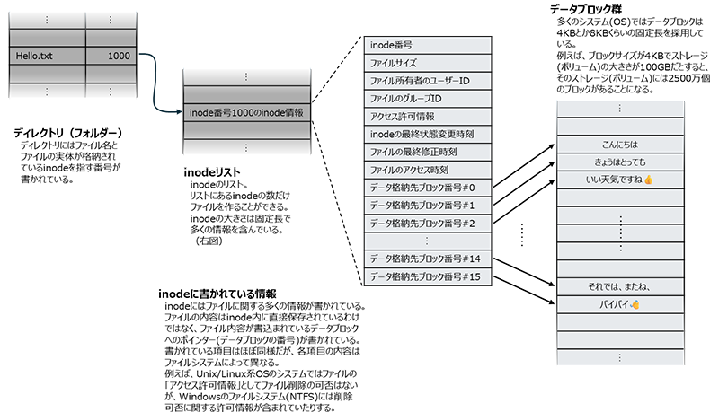 さて、もっと細かい話し。ファイルシステムにはいろいろなものがありますが、その中身と言うか構造が公開されているUnixやLinuxで古くから使われているinodeベースのファイルシステムを例に説明することにします。
