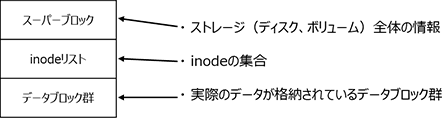 ちなみに「ディレクトリ(フォルダー)」は普通はファイル(ちょっと特殊な)として実装されていますが、「inodeリスト」や「データブロック群」はストレージ(ディスク)内の特定の領域にまとめて置かれていたりします。ディスクを初期化(フォーマットすると)上図のような感じで各領域がディスク上に配置されたりします。