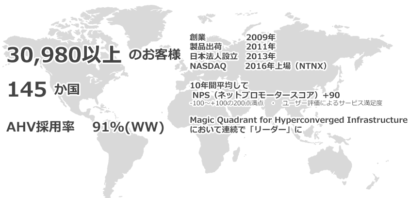 NutanixはHCIテクノロジーにおけるリーダーに位置づけられる世界的メーカーです。お客様がデータセンターを最新化し、あらゆる規模でオンプレミスおよびクラウドのアプリケーションを実行できるようサポートします。