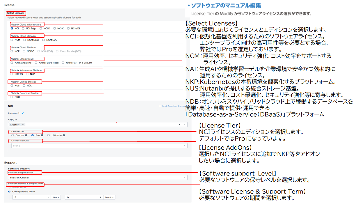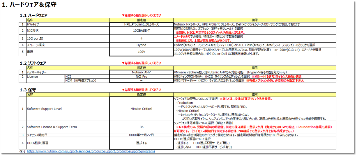 ①ハードウェアの指定、ソフトウェアライセンス、保守期間等について確認します。