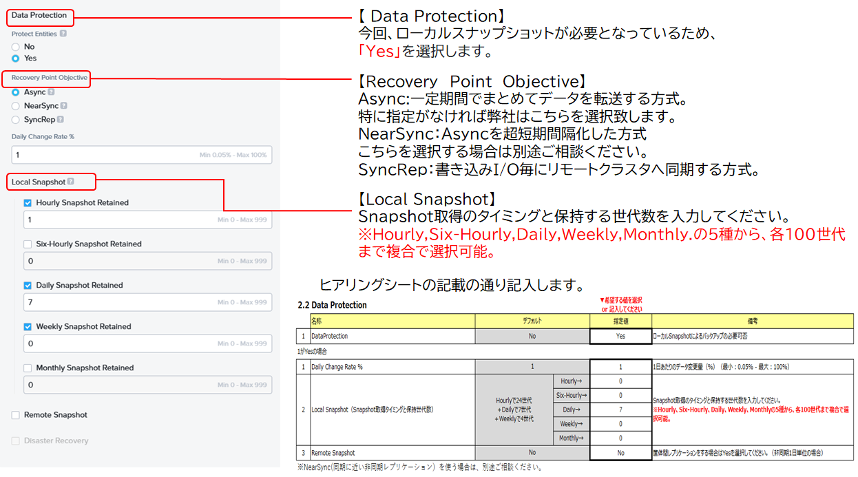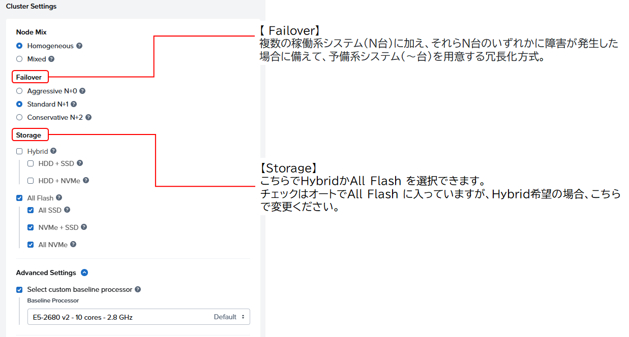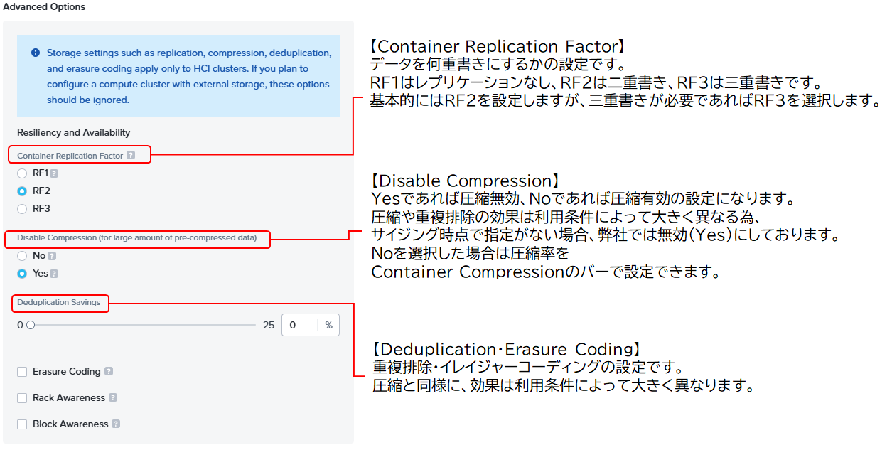 ②Sizerへの入力値を確認します。データの可用性(RF2 もしくは3)、スナップショットの要否を指定します。