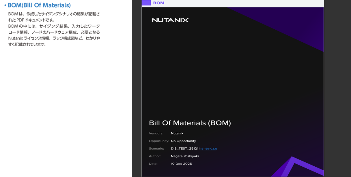 仮想化基盤の構成要件作成には、従来、数週間の時間を要していましたが、Nutanix がパートナーポータルで提供しているサイジングツール「Sizer」を利用すると、わずか1 日で構成要件をまとめることが可能になります。Sizer 利用により、ラック搭載図や電源容量まで含む構成部品資料(BOM) が容易に作成できます。