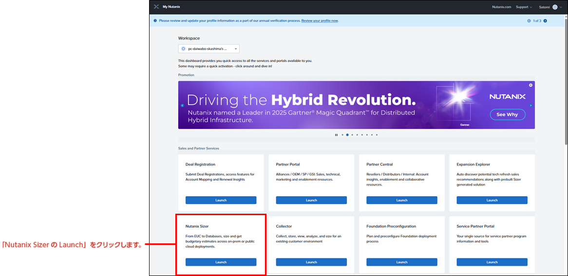 My Nutanix トップページからNutanix Sizer のLaunch をクリック