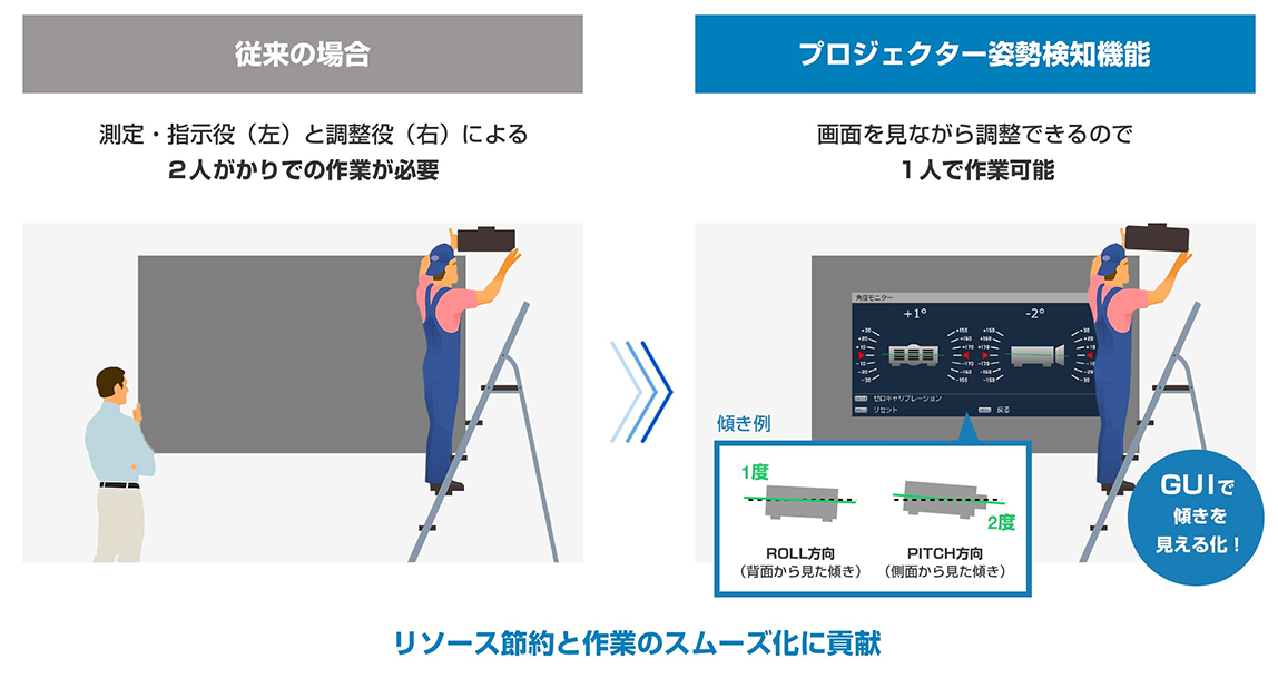 天つり時に本体を傾けて設置する場合、測定・指示役と調整役の2名の人員が必要となり、作業上大きな負担となっています。このような問題を解決するため、VMZ82シリーズは「角度モニター」を搭載しています。内部センサーが検知した角度をもとに、前転(PITCH)/側転(ROLL)の傾きを投写画面上にシミュレーション表示。スクリーンを見ながら一人で調整でき、取り付け作業の省力化・スムーズ化に貢献します。