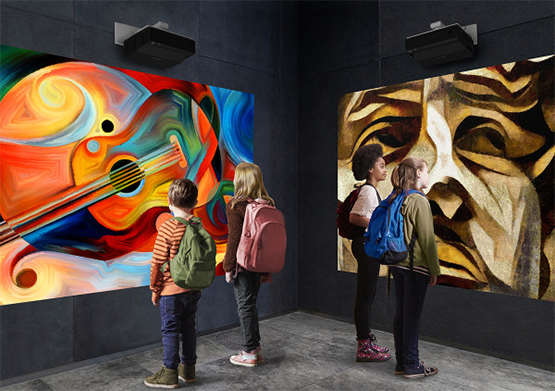 超短焦点プロジェクターなら、天井スペースが限られている場合にも壁掛け設置が可能。プロジェクターのすぐ下に投写できるので、低天井でも安心です。筐体は流線的でなめらかなデザインを採用。白・黒の2色をご用意し、教室・会議室だけでなく、展示室などの暗めの空間にも調和します。