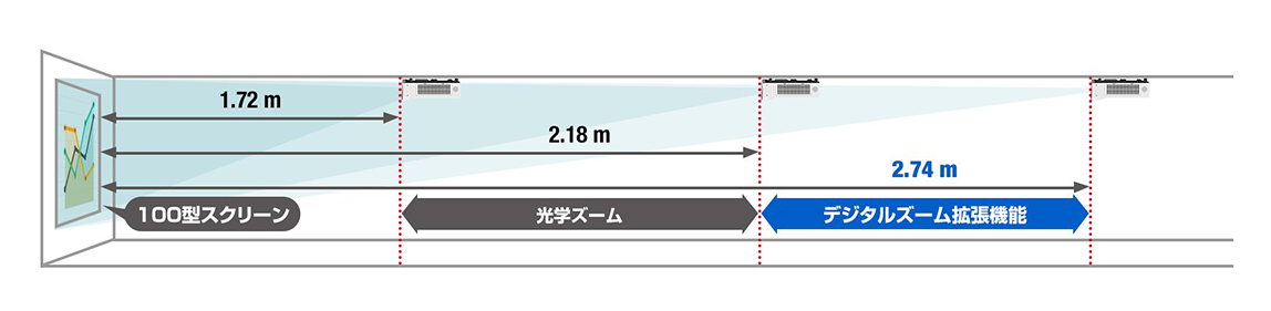 光学ズーム範囲を拡張し、スクリーン調整にさらなる幅を与える「デジタルズーム拡張」機能を搭載。プロジェクターの位置がスクリーンから離れている場合も、天つり金具を動かすことなく柔軟にリプレイスいただけます。さらに「デジタル画像シフト」機能を用いれば、スクリーン位置の細かな調整が可能に。上下左右10%ずつの調整幅を確保し、斜めからの投写や、高天井への設置にも対応します。